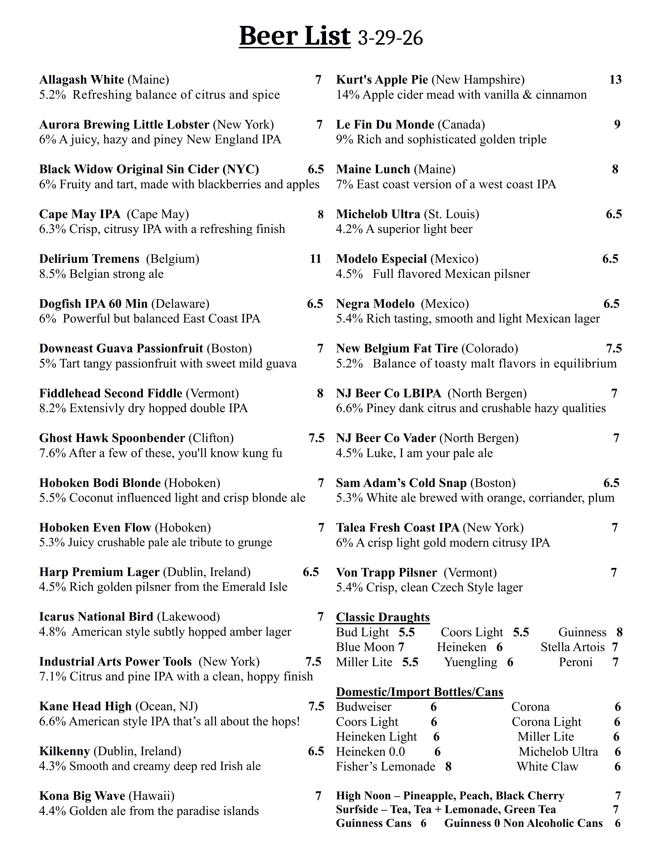Brew Menu, Wine List & Packaged Goods