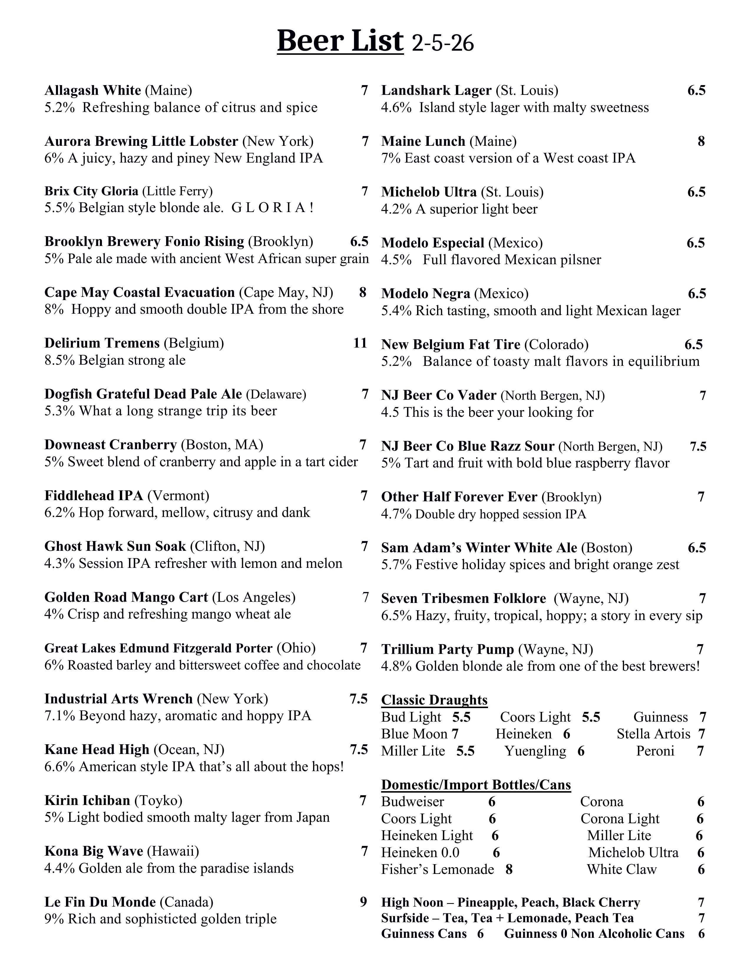 Brew Menu, Wine List & Packaged Goods